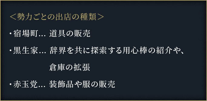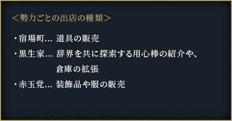 勢力の「満足度」が上昇すると、鍛冶屋の隣に出店がオープン。「満足度」を上げることで品揃えも良くなる。